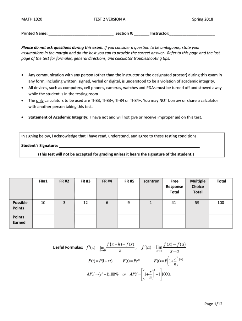 MATH 1020TEST 2 VERSION Spring 2018Printed Name: Section #: Instructor: Please do not ask questions during this exam. If you consider a question to be ambiguous, state your assumptions in the margin