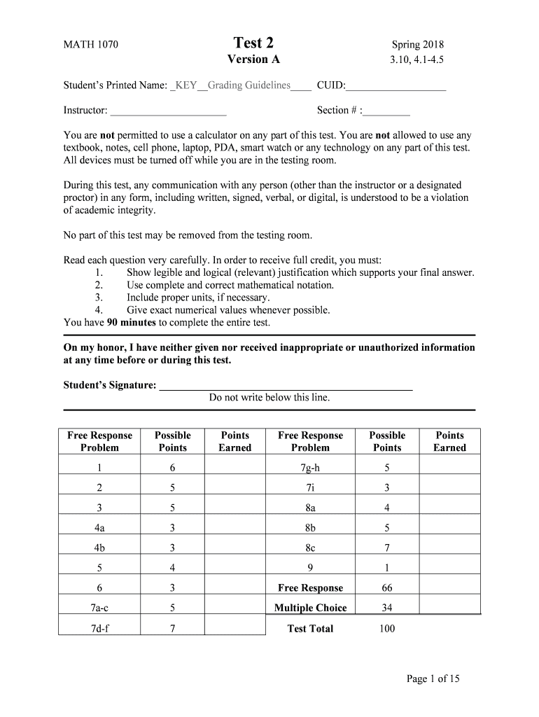 Get the free 1070 Test 2 S18 VA key & GG - Clemson Mathematical Sciences - mthsc clemson