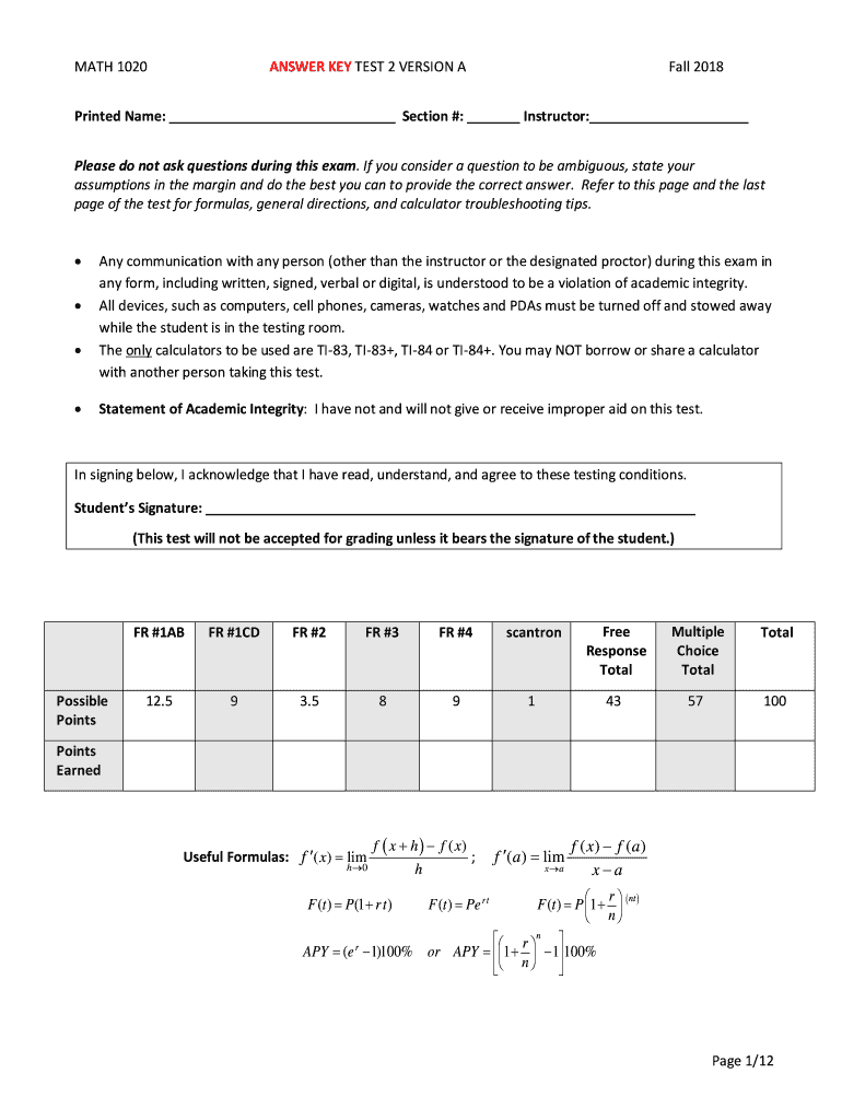 ANSWER KEY TEST 2 VERSION MATH 1020Fall 2018Printed Name: Section #: Instructor: Please do not ask questions during this exam. If you consider a question to be ambiguous, state your assumptions in