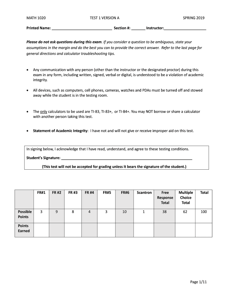 MATH 1020TEST 1 VERSION SPRING 2019Printed Name: Section #: Instructor: Please do not ask questions during this exam. If you consider a question to be ambiguous, state your assumptions in the margin