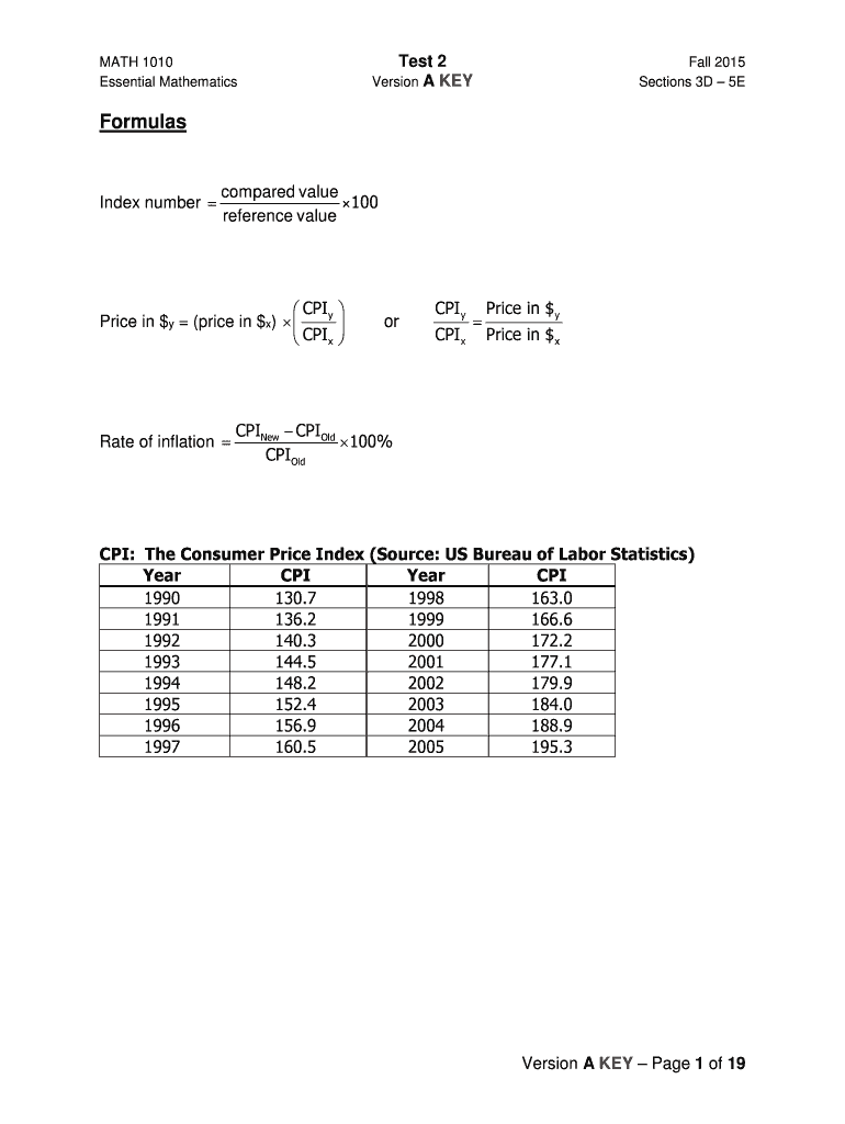 Test 2 Version A DEATH 1010 Essential Mathematical 2015 Sections 3D 5EFormulasIndex number compared value 100 reference value CPI y Price in by (price in ex) CPI x Rate of inflation or CPI y CPI price