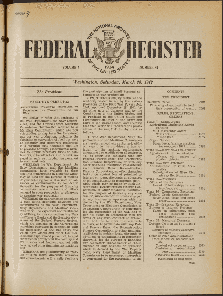 DEAL VOLUME 7REGISTEVW1934 NUMBER 61* ATE Washington, Saturday, March 28, 1942, The President EXECUTIVE ORDER 9112 Authorizing Financing Contracts to Facilitate the Prosecution of the W whereas in