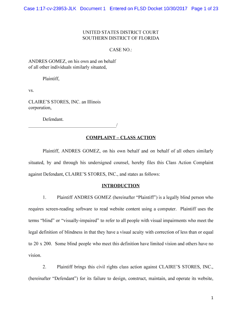 Case 1:17cv23953JLK Document 1 Entered on FLED Docket 10/30/2017-Page 1 of 23UNITED STATES DISTRICT COURT SOUTHERN DISTRICT OF FLORIDA CASE NO.: ANDRES GOMEZ, on his own and on behalf of all other