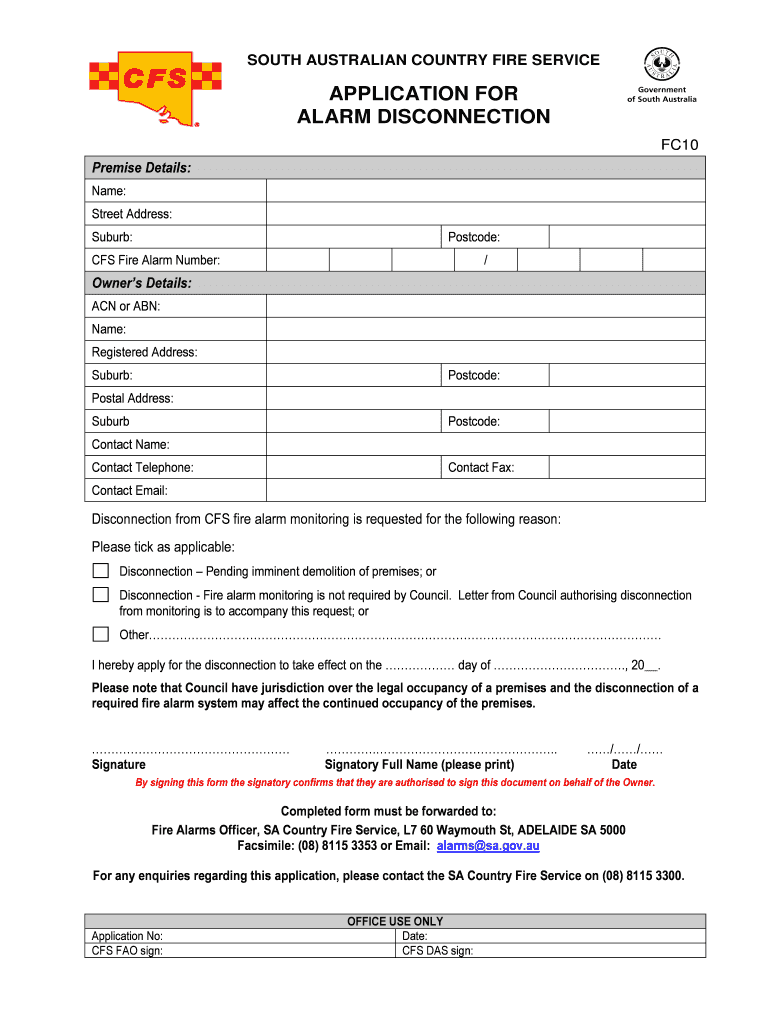 SOUTH AUSTRALIAN COUNTRY FIRE SERVICEAPPLICATION FOR ALARM DISCONNECTION FC10 Premise Details: Name: Street Address: Suburb:Postcode:CFS Fire Alarm Number:/Owners Details: ACN or ABN: Name: Registered