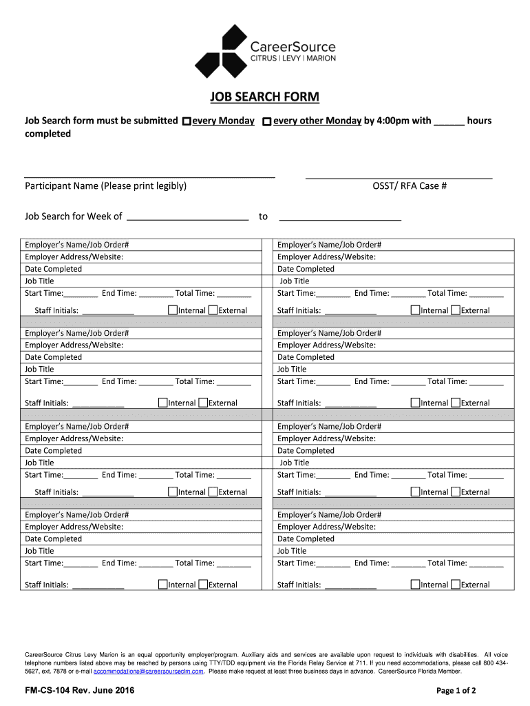 JOB SEARCH FORM Job Search form must be submitted completed every Monday every other Monday by 4:00pm with hoursParticipant Name (Please print legibly)SST/ RFA Case #Job Search for Week oftoEmployers
