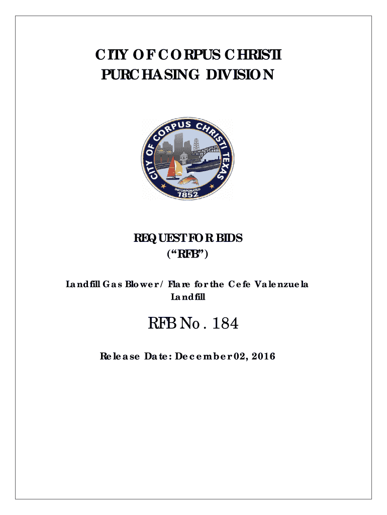 CITY OF CORPUS CHRISTI PURCHASING DIVISIONREQUEST FOR BIDS (ROB) Landfill Gas Blower / Flare for the Café Valenzuela Landfill No. 184 Release Date: December 02, 2016Table of ContentsSection 1 Notice