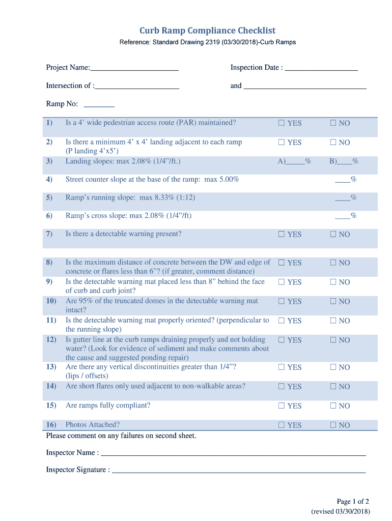 Curb Ramp Compliance Checklist Reference: Standard Drawing Ramps Drawing 2319 2319 (06/01/2013)Curb (03/30/2018)Curb RampsProject Name: Inspection Date : Intersection of : and Ramp No: 1)Is a 4 wide
