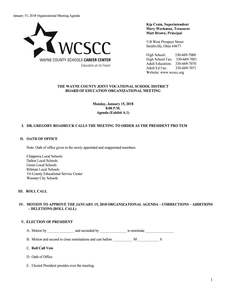January 15, 2018, Organizational Meeting Agenda Kip Train, Superintendent