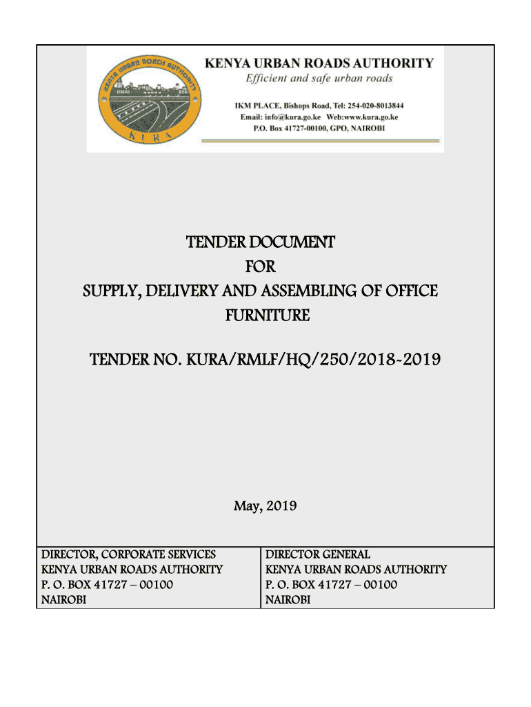 TENDER DOCUMENT FOR SUPPLY, DELIVERY AND ASSEMBLING OF OFFICE FURNITURE TENDER NO. KURT/MLF/HQ/250/20182019May, 2019DIRECTOR, CORPORATE SERVICES KENYA URBAN ROADS AUTHORITY P. O. BOX 41727 00100 NAIROBIDIRECTOR
