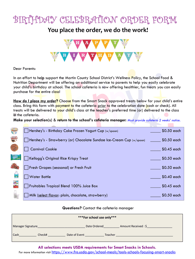 BIRTHDAY CELEBRATION ORDER FORM You place the order, we do the work! Dear Parents: In an effort to help support the Martin County School Districts Wellness Policy, the School Food & Nutrition Department