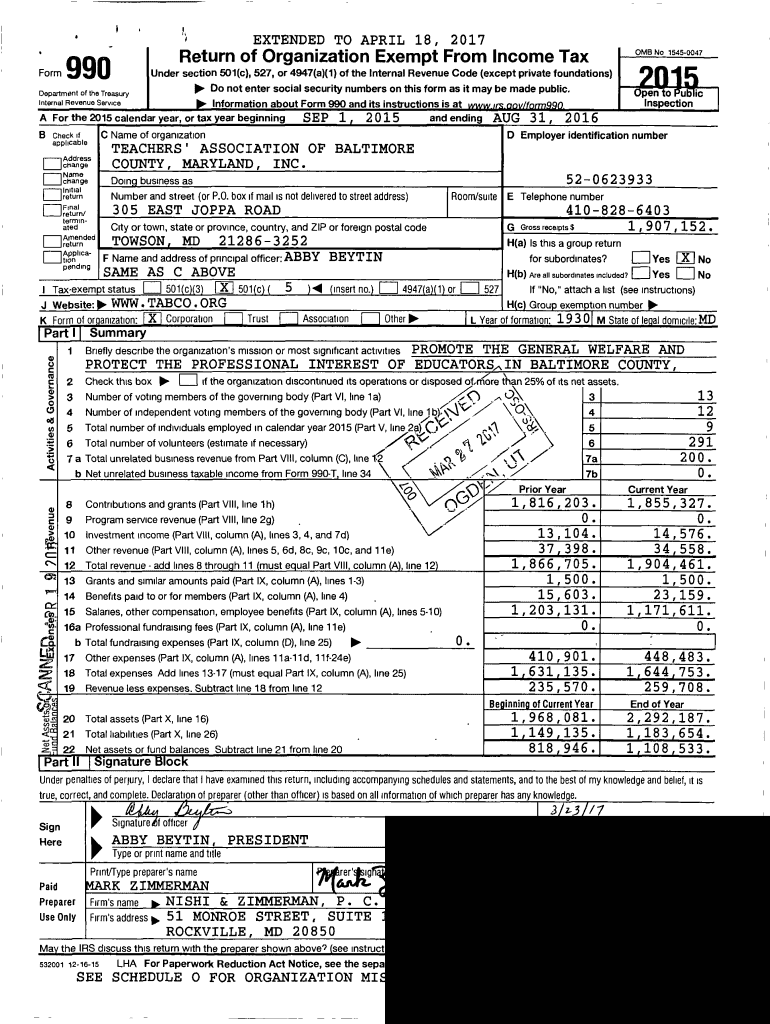 I.1EXTENDED TO APRIL 18, FormReturn of Organization Exempt From Income Tax990 Do not enter social security numbers on this form as it may be made public.SEP1, and ending2015AUGC Name of organizationCOUNTY,