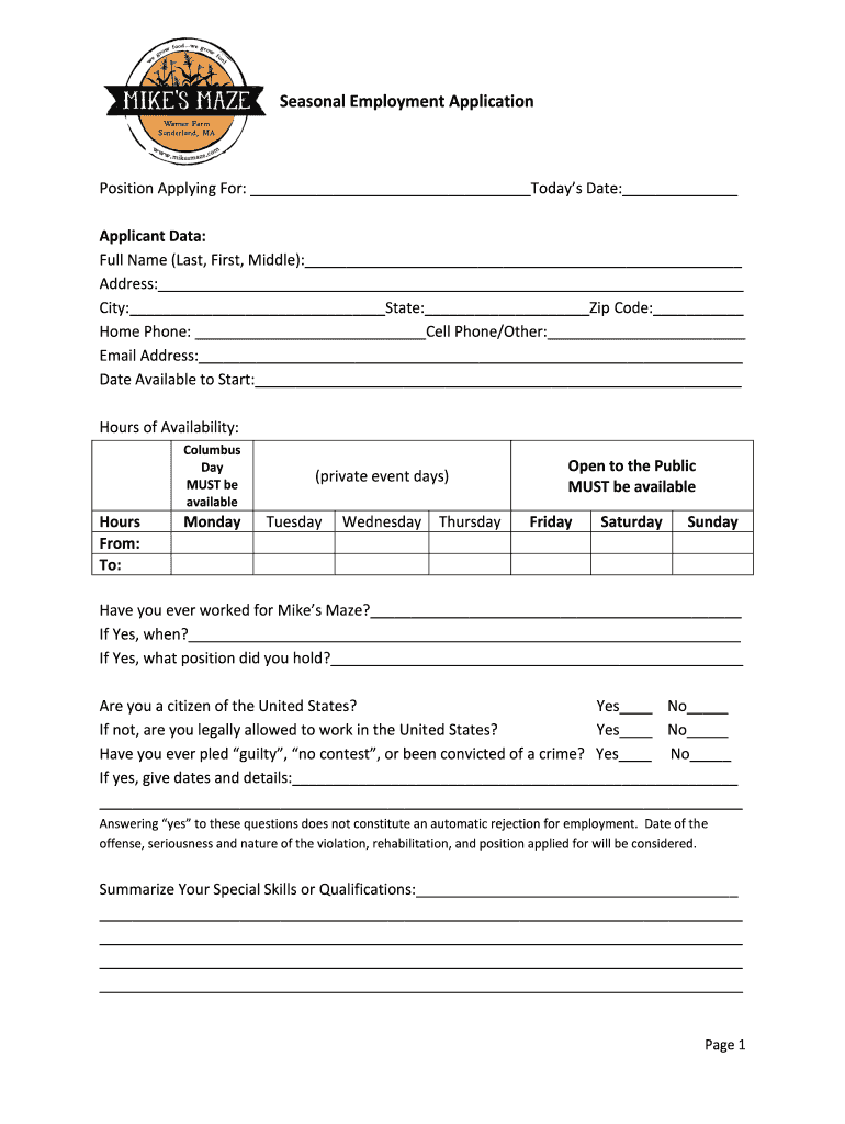 Seasonal Employment ApplicationPosition Applying For: Today's Date: Applicant Data: Full Name (Last, First, Middle): Address: City: State: Zip Code: Home Phone: Cell Phone/Other: Email Address: Date