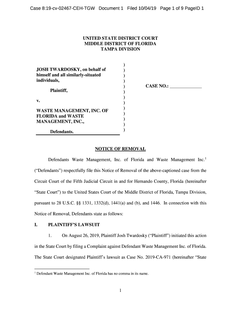 Case 8:19cv02467CEHTGW Document 1 Filed 10/04/19-Page 1 of 9 Paged 1UNITED STATE DISTRICT COURT MIDDLE DISTRICT OF FLORIDA TAMPA DIVISION)))))))))))))JOSH TWARDOSKY, on behalf of himself and all similarly