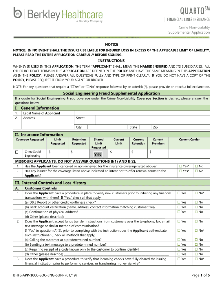 QUARTOS FINANCIAL LINES INSURANCE Crime Liability Supplemental Application NOTICE: IN NO EVENT SHALL THE INSURER BE LIABLE FOR INSURED LOSS IN EXCESS OF THE APPLICABLE LIMIT OF LIABILITY. PLEASE READ