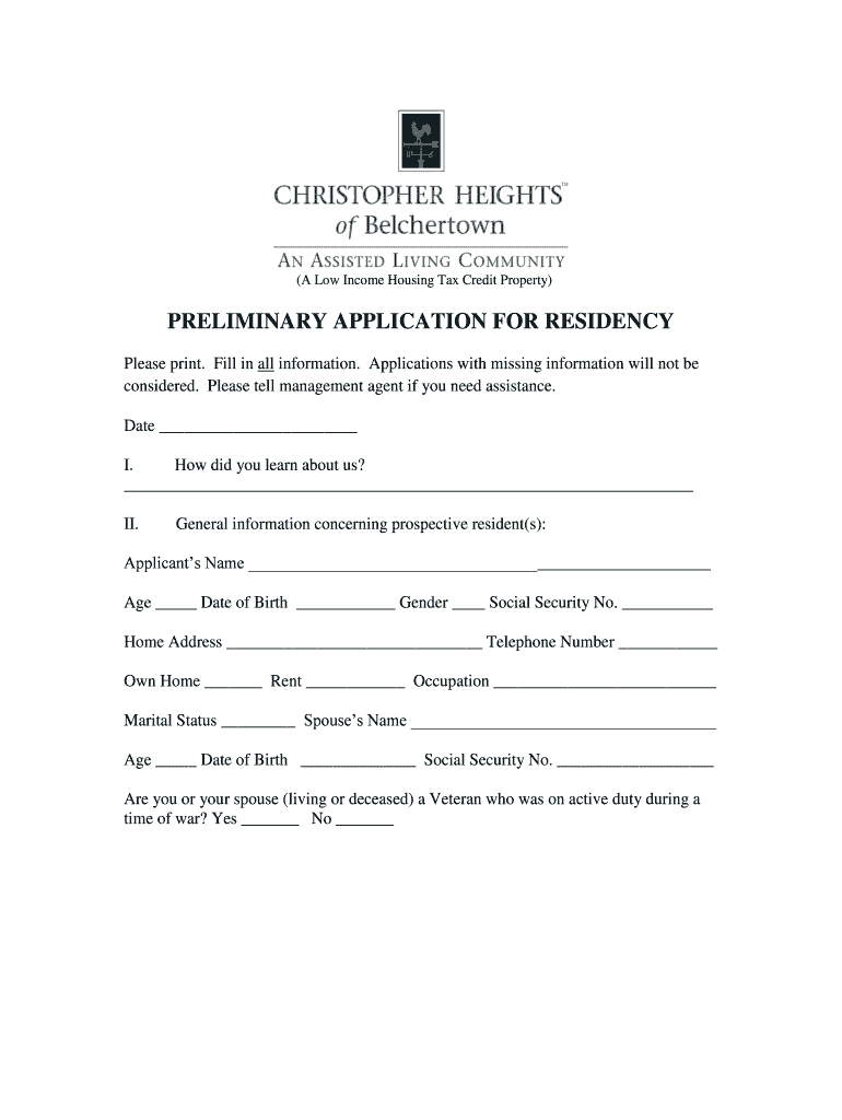 (A Low Income Housing Tax Credit Property)PRELIMINARY APPLICATION FOR RESIDENCY Please print. Fill in all information. Applications with missing information will not be considered. Please tell management
