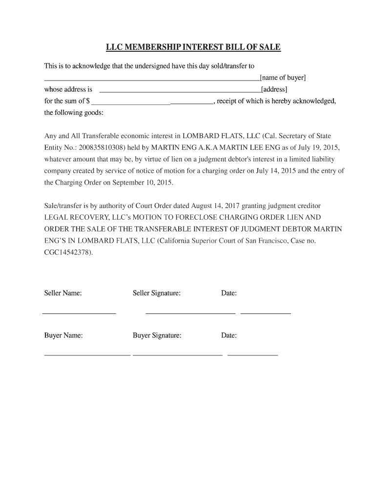 LLC MEMBERSHIP INTEREST BILL OF SALE This is to acknowledge that the undersigned have this day sold/transfer to name of buyer whose address is address for the sum of $, receipt of which is hereby