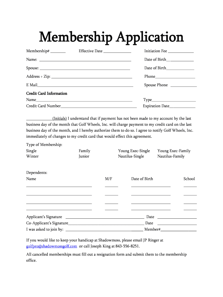 Membership Application Membership×Effective Database: Spouse: Address + Zip: E Mail Initiation Fee Date of Birth Date of Birth Phone Spouse Noncredit Card Information Name Type Credit Card Number