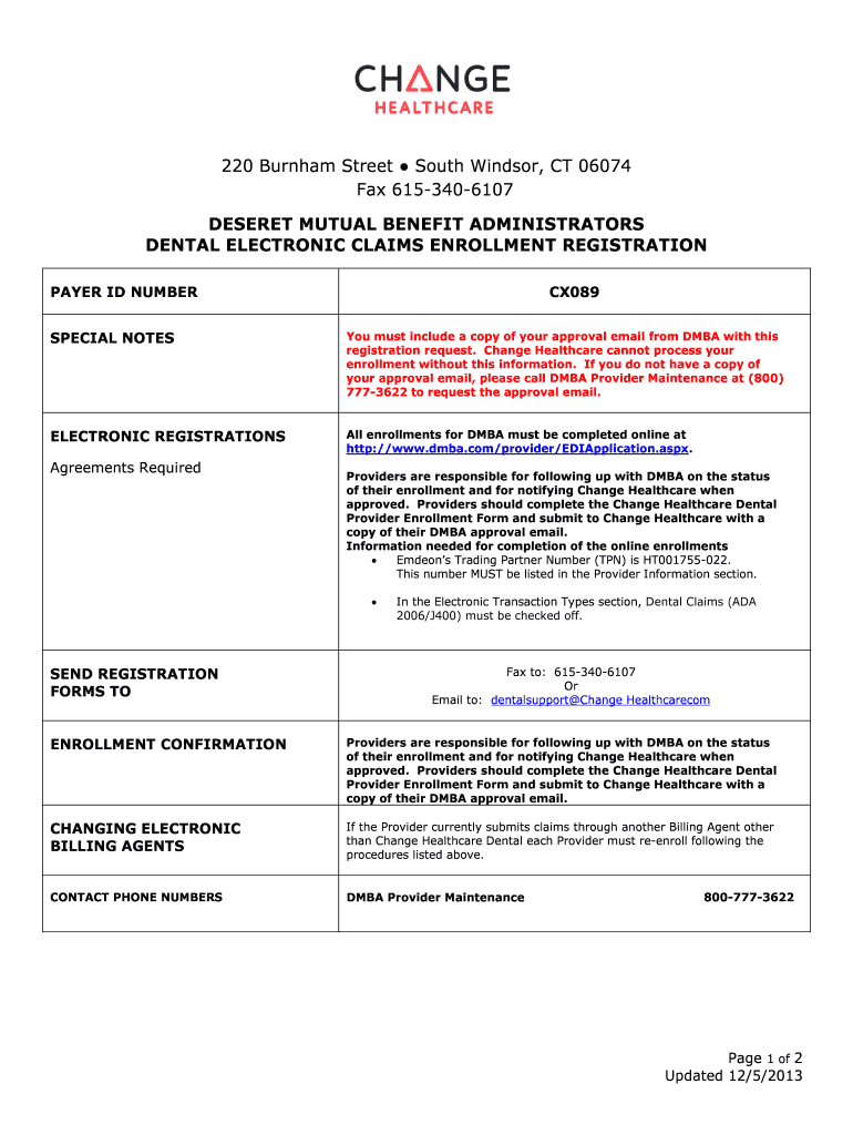 220 Burnham Street South Windsor, CT 06074 Fax 6153406107 DESERT MUTUAL BENEFIT ADMINISTRATORS DENTAL ELECTRONIC CLAIMS ENROLLMENT REGISTRATION PAYER ID NUMBERCX089SPECIAL Notes must include a copy