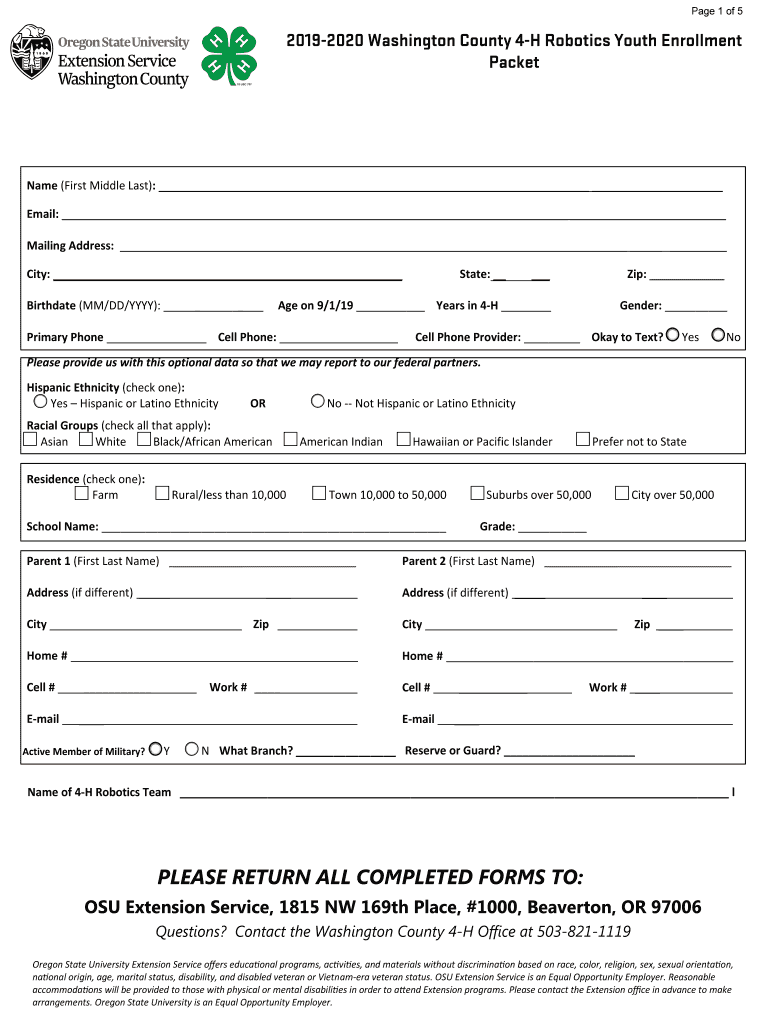 Page 1 of 520192020 Washington County 4H Robotics Youth Enrollment Packetize (First Middle Last): Email: Mailing Address: City: Birthdate (MM/DD/YYY): Zip: Age on 9/1/19 Years in 4H Gender: Primary