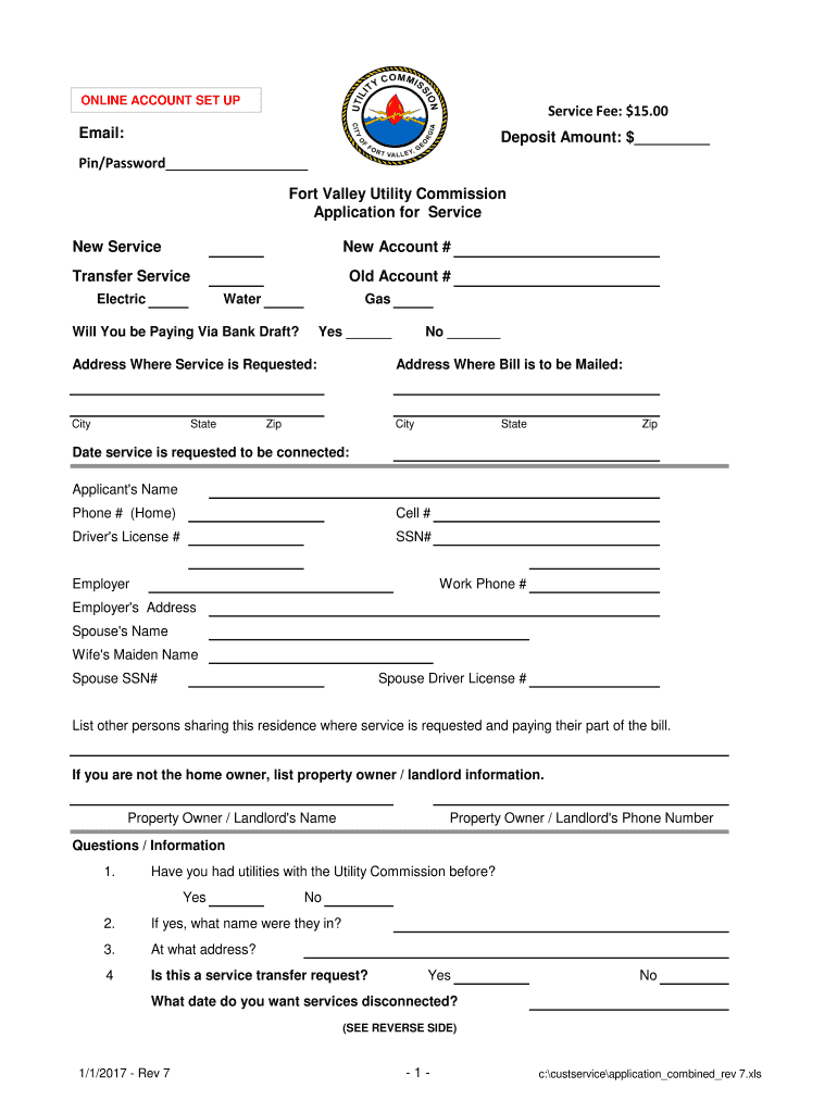 ONLINE ACCOUNT SET Service Fee: $15.00Email: Deposit Amount: $ Pin/Password Fort Valley Utility Commission Application for Service New ServiceNow Account #Transfer Serviced Account #ElectricWaterGasWill