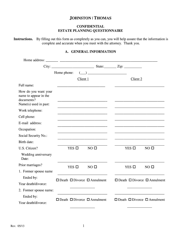 JOHNSTON THOMAS CONFIDENTIAL ESTATE PLANNING QUESTIONNAIRE Instructions. By filling out this form as completely as you can, you will help assure that the information is complete and accurate when
