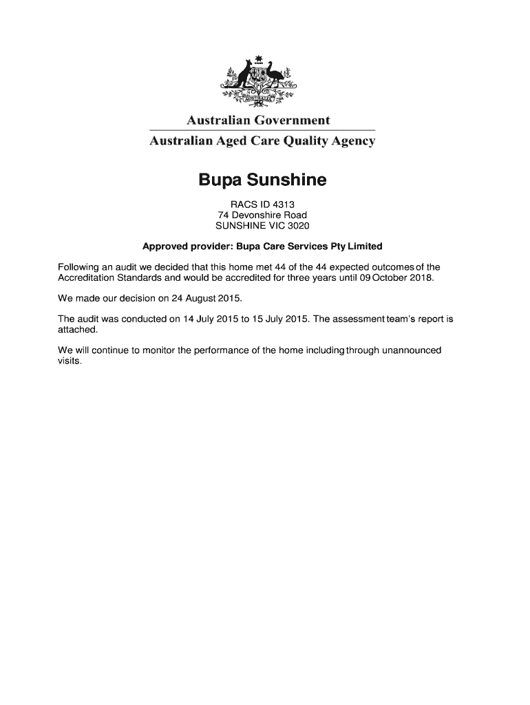 Get the free Bupa Sunshine - Aged Care Quality and Safety Commission