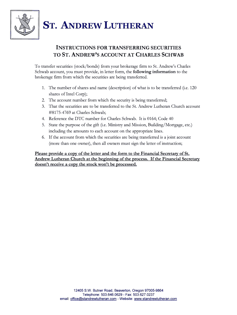 To transfer securities (stock/bonds) from your brokerage firm to St. Andrews Charles