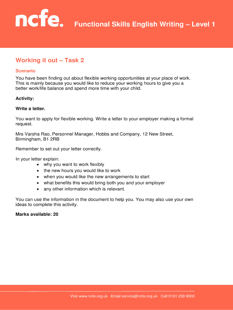 Functional Skills English Writing Level 1Working it out Tasks 2 Scenario You have been finding out about flexible working opportunities at your place of work. This is mainly because you would like