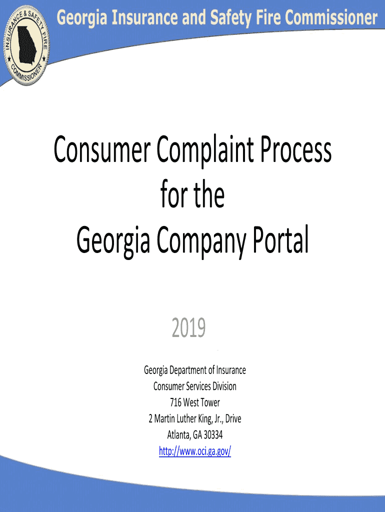 ConsumerComplaintProcess forth GeorgiaCompanyPortal 2019 GeorgiaDepartmentofInsurance ConsumerServicesDivision 716WestTower 2MartinLutherKing,Jr., Drive Atlanta,GA30334 http://www.oci.ga.gov/ TheConsumerServicesDivisionoftheGeorgiaDepartmentofInsurance(GA