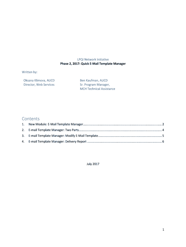 LPI Network Initiative Phase 2, 2017: Quick Email Template Manager Written by: Oksana Lima, ACD Director, Web Services Ben Kaufman, ACD Sr. Program Manager, MCH Technical AssistanceContents 1. New