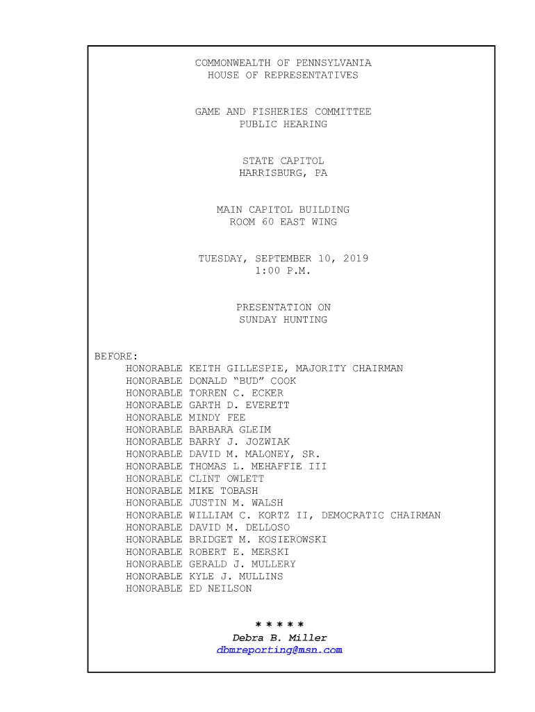 COMMONWEALTH OF PENNSYLVANIA HOUSE OF REPRESENTATIVESGAME AND FISHERIES COMMITTEE PUBLIC HEARINGSTATE CAPITOL HARRISBURG, AGAIN CAPITOL BUILDING ROOM 60 EAST mid-Tuesday, SEPTEMBER 10, 2 019 1:00