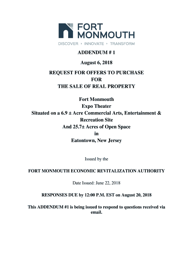 ADDENDUM # 1 August 6, 2018, REQUEST FOR OFFERS TO PURCHASE FOR THE SALE OF REAL PROPERTY Fort Monmouth Expo Theater Situated on a 6.9 Acre Commercial Arts, Entertainment & Recreation Site And 25.7