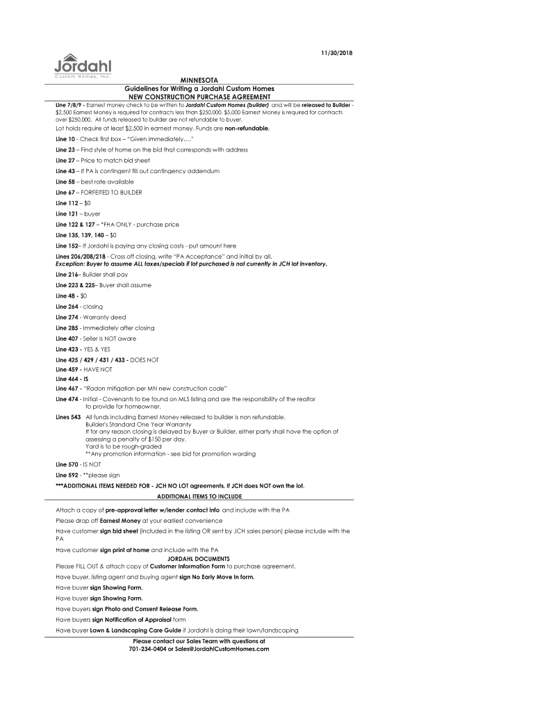 11/30/2018MINNESOTA Guidelines for Writing a Jordan Custom Homes NEW CONSTRUCTION PURCHASE AGREEMENTLine 7/8/9 Earnest money check to be written to Jordan Custom Homes (builder) and will be released
