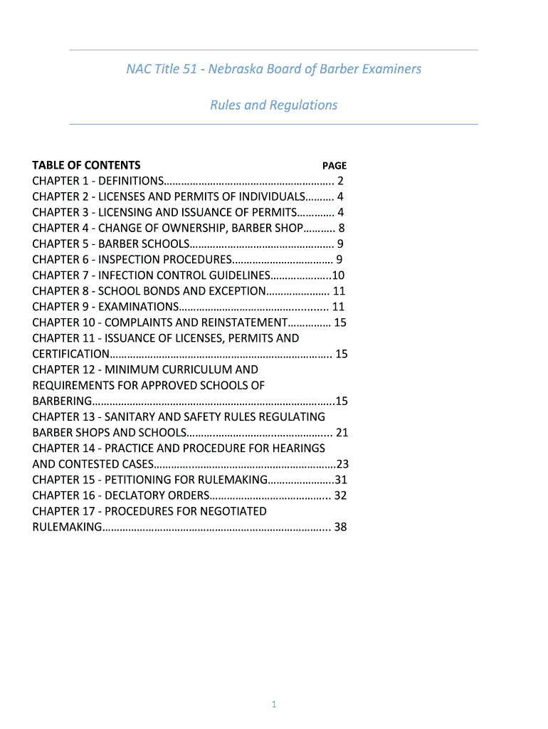 NAC Title 51 Nebraska Board of Barber Examiners Rules and RegulationsTABLE OF CONTENTS PAGE CHAPTER 1 DEFINITIONS. 2 CHAPTER 2 LICENSES AND PERMITS OF INDIVIDUALS. 4 CHAPTER 3 LICENSING AND ISSUANCE