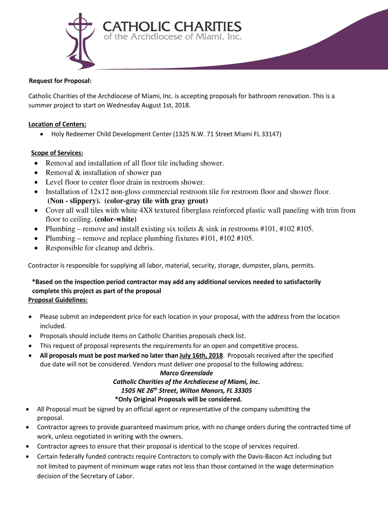 Request for Proposal: Catholic Charities of the Archdiocese of Miami, Inc. is accepting proposals for bathroom renovation. This is a summer project to start on Wednesday, August 1st, 2018. Location