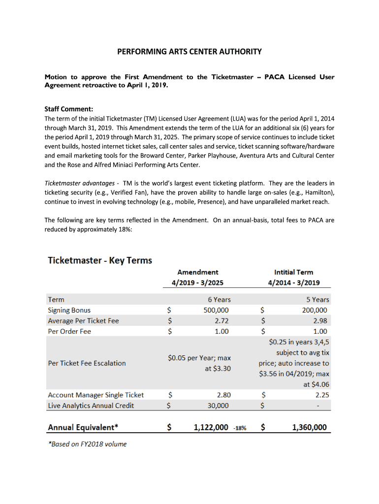 PERFORMING ARTS CENTER AUTHORITY Motion to approve the First Amendment to the Ticketmaster PACA Licensed User Agreement retroactive to April 1, 2019. Staff Comment: The term of the initial Ticketmaster