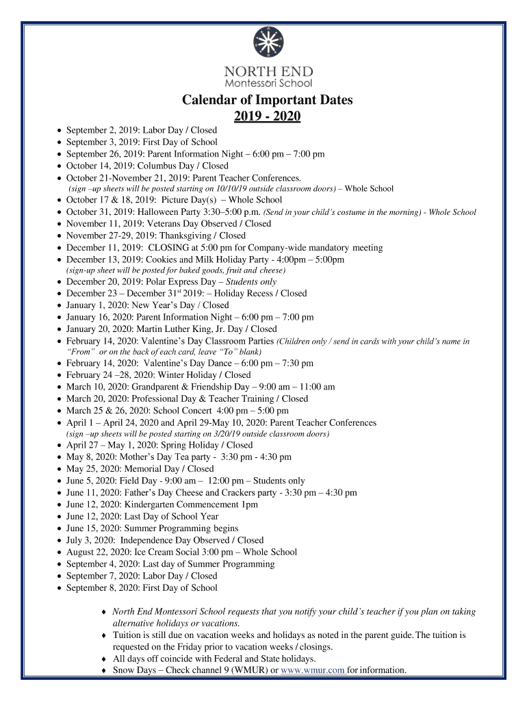 Calendar of Important Dates 2019 2020 September 2, 2019: Labor Day / Closed September 3, 2019: First Day of School September 26, 2019: Parent Information Night 6:00 pm 7:00 pm October 14, 2019: Columbus