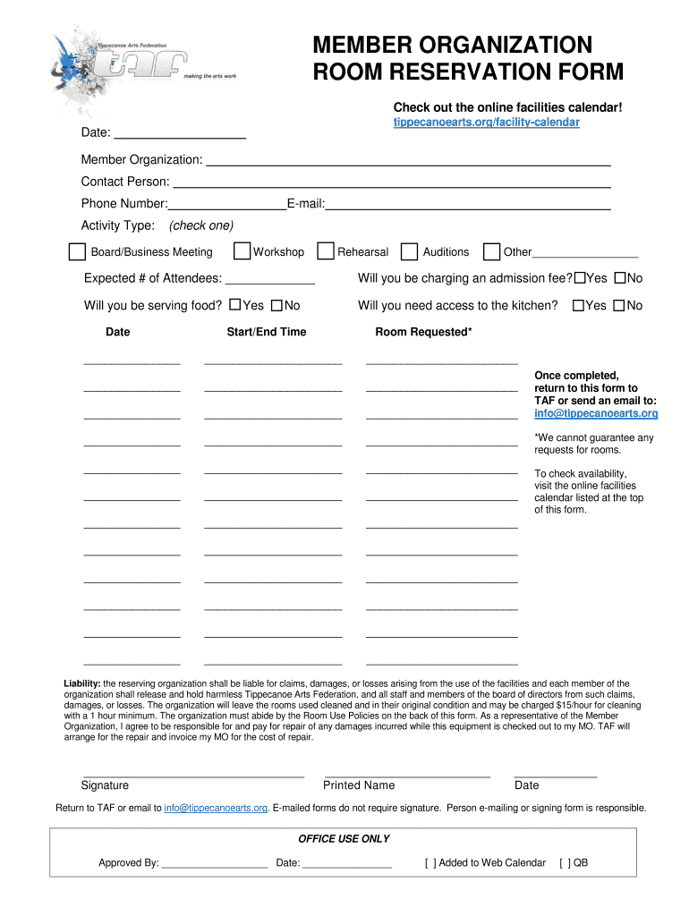 MEMBER ORGANIZATION ROOM RESERVATION FORM Check out the online facilities calendar! tippecanoearts.org/facilitycalendarDate: Member Organization: Contact Person: Phone Number: Activity Type:Email: