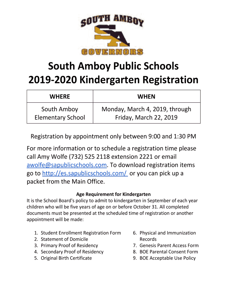 South Am boy Public Schools 20192020 Kindergarten Registration WHEREWHENSouth Am boy Elementary School Monday, March 4, 2019, through Friday, March 22, 2019Registration by appointment only between