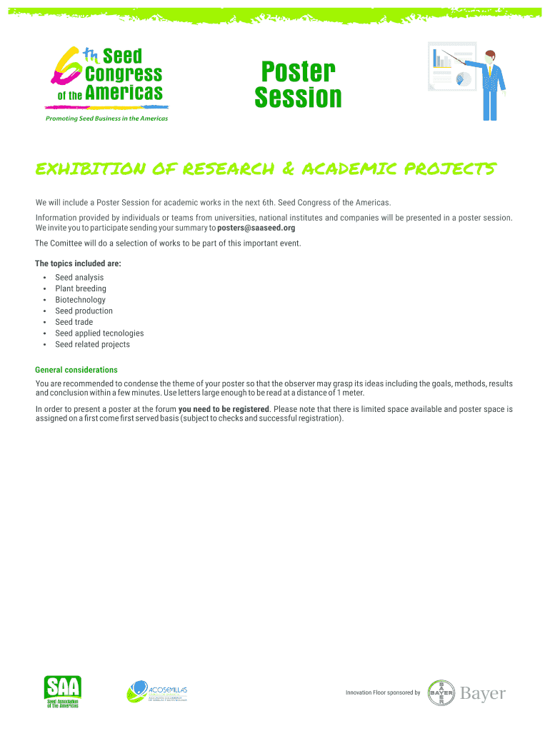 Seed Congress of the AmericasPoster SessionPromoting Seed Business in the AmericasEXHIBITION OF RESEARCH & ACADEMIC PROJECTS We will include a Poster Session for academic works in the next 6th. Seed