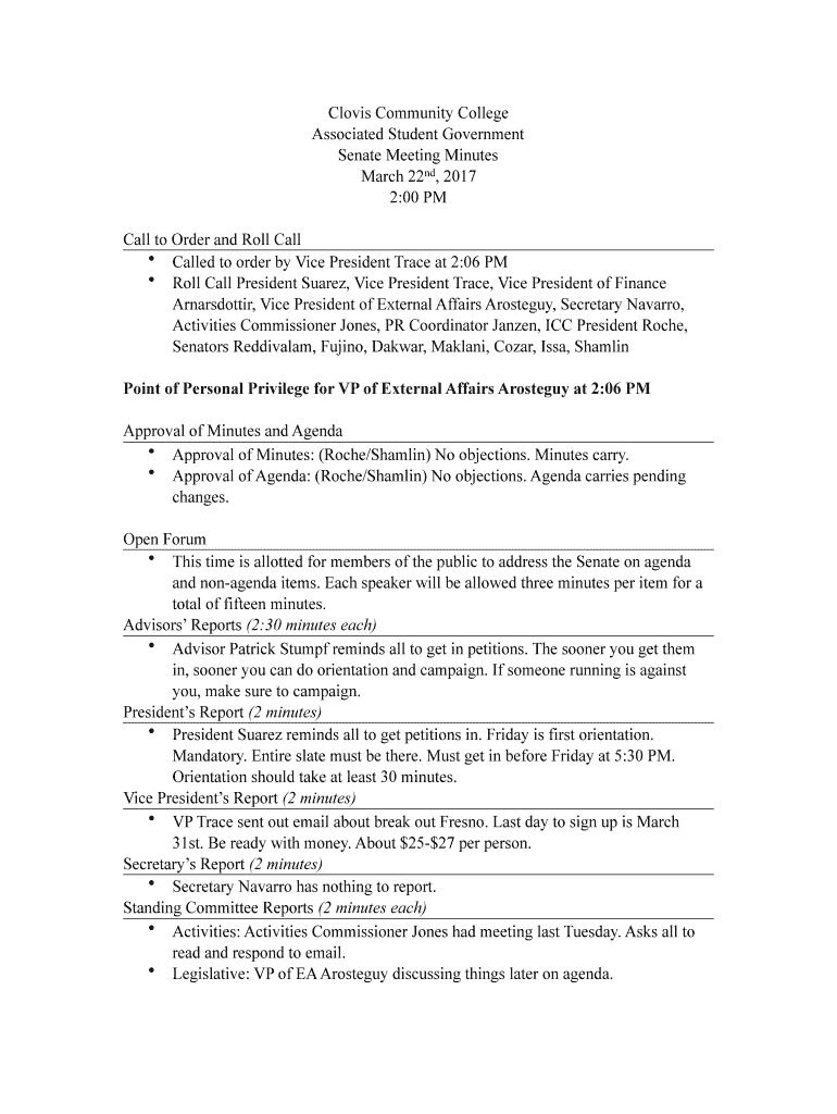 Clovis Community College Associated Student Government Senate Meeting Minutes March 22nd, 2017 2:00 PM Call to Order and Roll Call Called to order by Vice President Trace at 2:06 PM Roll Call President
