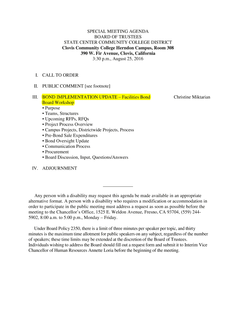 SPECIAL MEETING AGENDA BOARD OF TRUSTEES STATE CENTER COMMUNITY COLLEGE DISTRICT Clovis Community College Herndon Campus, Room 308 390 W. Fir Avenue, Clovis, California 3:30 p.m., August 25, 2016I.