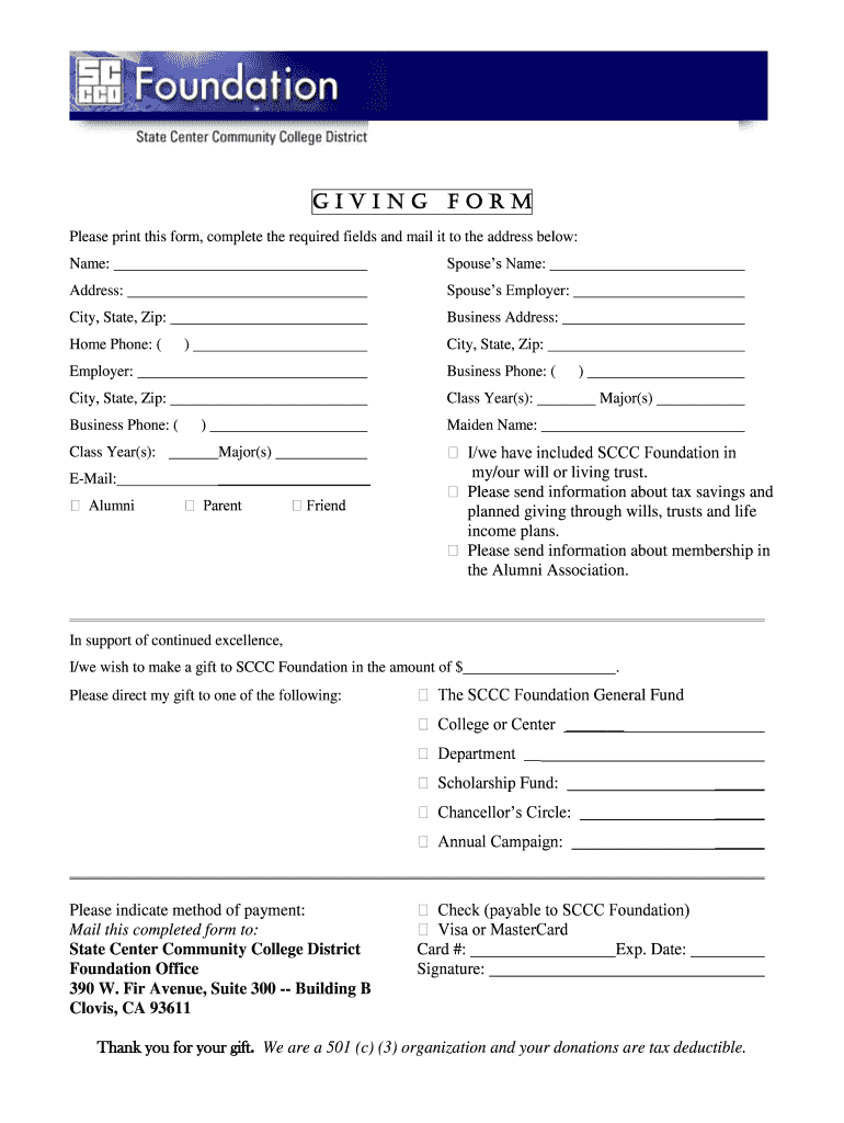 GIvIngformPlease print this form, complete the required fields and mail it to the address below: Name:Spouses Name:Address:Spouses Employer:City, State, Zip:Business Address:Home Phone: ()City, State,