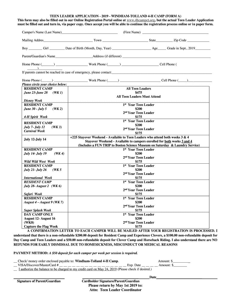 TEEN LEADER APPLICATION 2019 WINDHAMTOLLAND 4H CAMP (FORM A) This form may also be filled out in our Online Registration Portal online at www.4hcampct.org, but the actual Teen Leader Application must