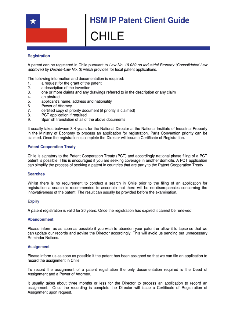 A patent can be registered in Chile pursuant to Law No. 19.039 on Industrial Property (Consolidated Law