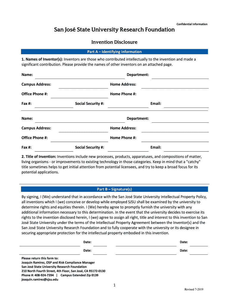 San Jo's State University Research FoundationConfidential InformationInvention Disclosure Part A Identifying Information 1. Names of Inventor(s): Inventors are those who contributed intellectually