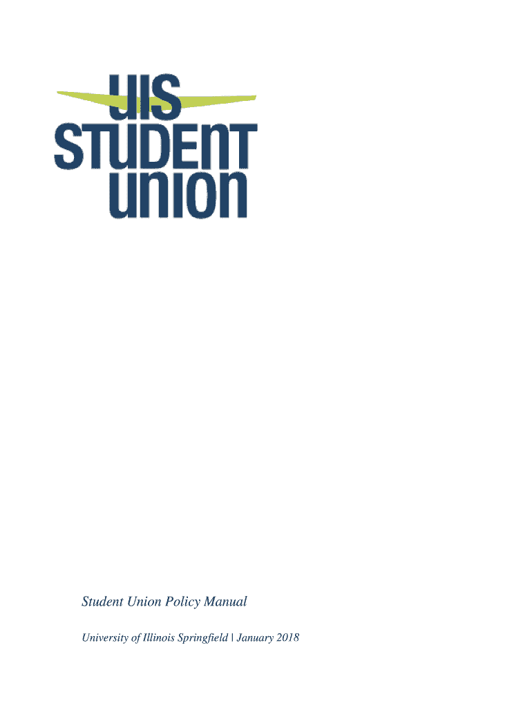 Student Union Policy Manual University of Illinois Springfield January 2018TABLE OF CONTENTS PURPOSE3MISSION AND MISSION DIRECTORY HOURS OF OPERATION3 4 5BUILDING POLICIES6GENERAL BUILDING POLICIES: