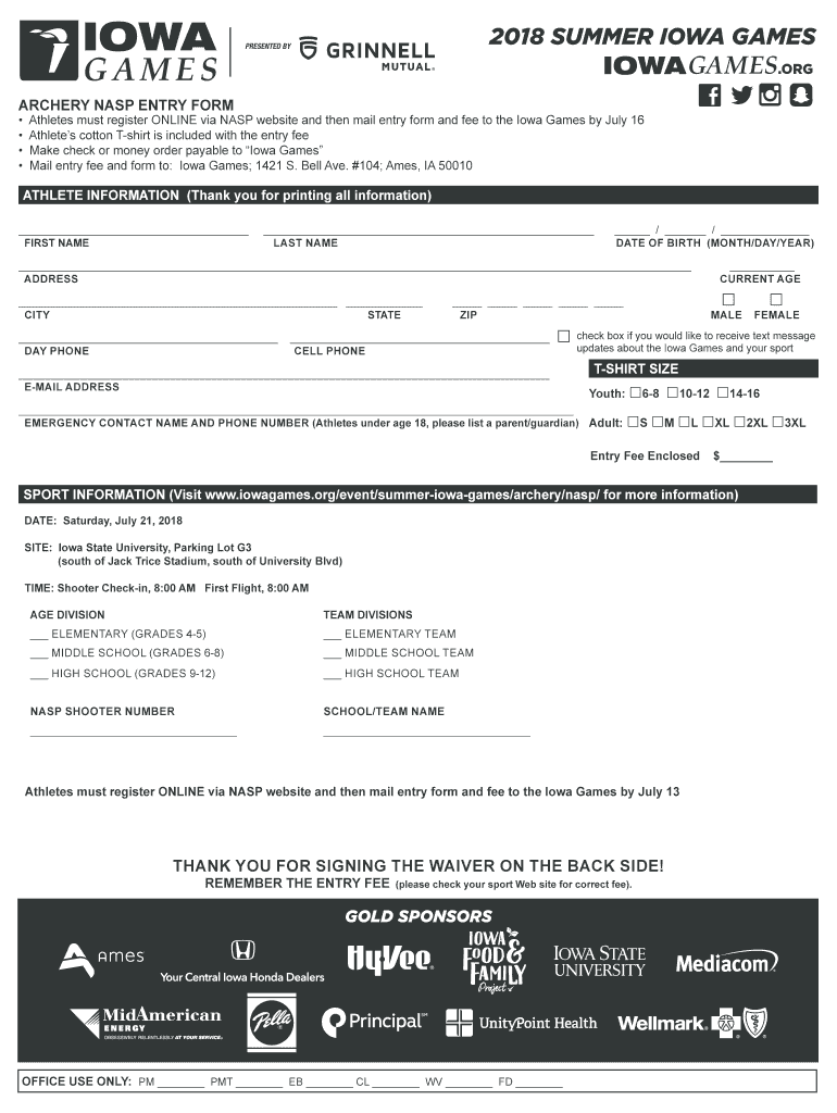 2018 SUMMER IOWA GAMES ARCHERY NASA ENTRY FORM Athletes must register ONLINE via NASA website and then mail entry form and fee to the Iowa Games by July 16 Athletes cotton Shirt is included with the