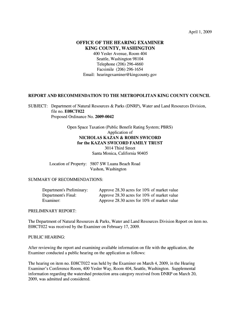April 1, 2009OFFICE OF THE HEARING EXAMINER KING COUNTY, WASHINGTON 400 Lesser Avenue, Room 404 Seattle, Washington 98104 Telephone (206) 2964660 Facsimile (206) 2961654 Email: hearing examiner King