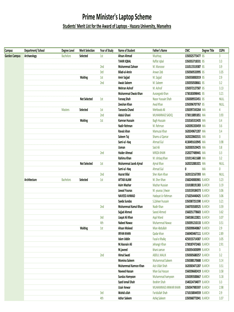 This document contains the merit list of students from Hazara University who are selected, waiting, or not selected for the award of laptops under the Prime Minister's Laptop Scheme, categorized by